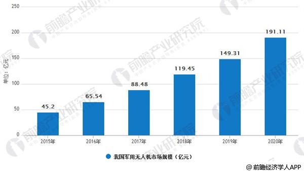 我国军用无人机市场前景广阔。《中国制造2025》中提出,“将航空航天装备列入重点领域进行大力推广,推进无人机等航空装备产业化”。前瞻产业研究院数据显示,2015年我国军用无人机市场规模为45.2亿元,仅为全球市场的10%,在我国军费开支中占比约0.48%,而美国军备高峰期占比为 0.7%~0.8%。在航空装备无人化、小型化和智能化的趋势下,我国军用无人机市场发展迅速。2017年中国军用无人机市场规模达到了88.48亿元,预计2018年中国军用无人机市场规模将达到119.45亿元,未来将保持持续稳定增长。
