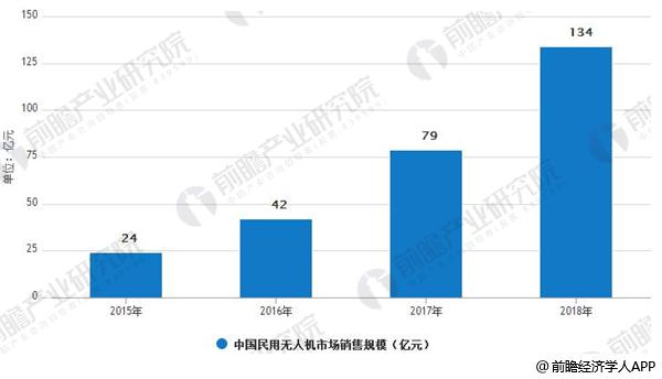 据前瞻产业研究院发布的《无人机行业市场需求预测及投资战略规划分析报告》数据显示,随着无人机技术的逐步成熟,民用无人机在日常生活中已经得到了广泛的应用。2015年中国民用无人机市场销售规模达到24亿元。随着无人机应用领域的逐渐扩大,无人机市场需求逐渐提升,预计有望在2018年突破100亿元大关,市场规模达到134亿元。