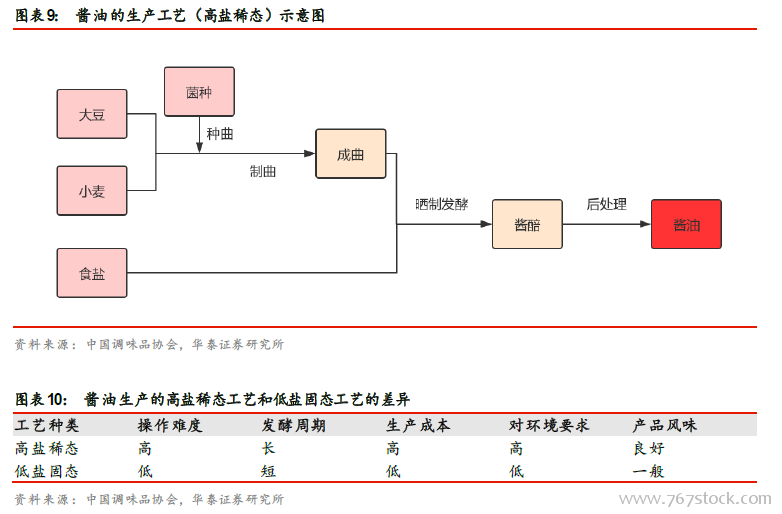 品类特点:发酵工艺是区域发展不均的原因。酱油的发酵工艺大致可以分为高盐稀态和低盐固态两类。其中高盐稀态发酵工艺是以大豆、小麦或麦麸为原料,经过蒸煮、曲霉菌制曲后与盐水混合成为稀醪,再经过发酵制成酱油的一种工艺;低盐固态发酵是以大豆、小麦或麦麸作为原料,经过蒸煮、曲霉菌制曲后与盐水混合成为固态酱醅,再经发酵制成酱油的一种工艺,低盐固态发酵操作容易、设备简单,成本低于高盐稀态工艺,低盐固态发酵周期一般在2-3 周,远远低于高盐稀态工艺发酵周期,风味和调味效果与高盐稀态工艺存在显著不同。
