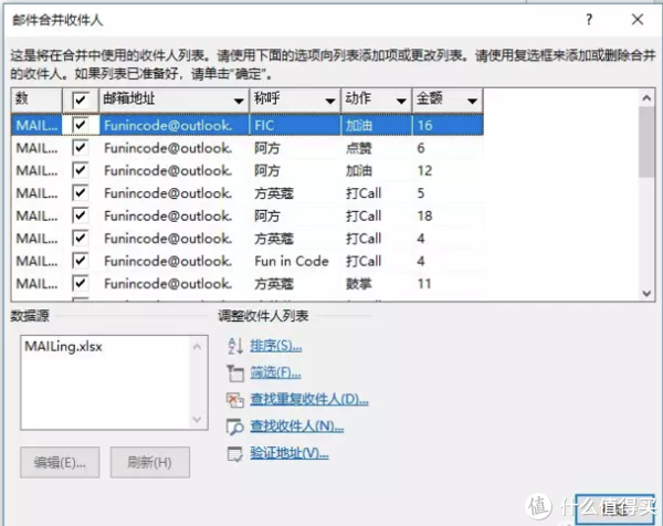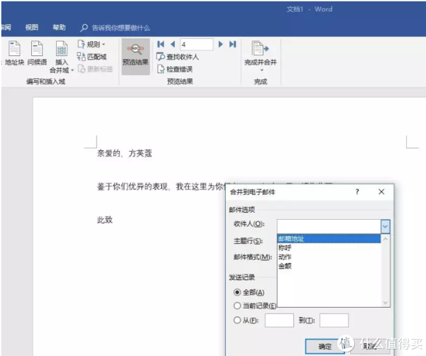 在跳出的对话框里面选择excel里面的列【邮件地址】来作为收件人。