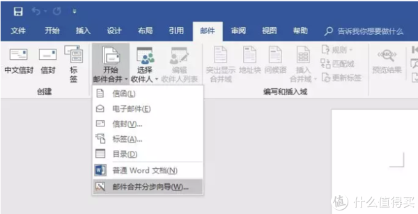 在【邮件】这个工具栏的【开始邮件合并】下面选择【邮件合并分步向导】