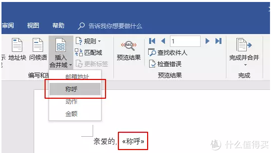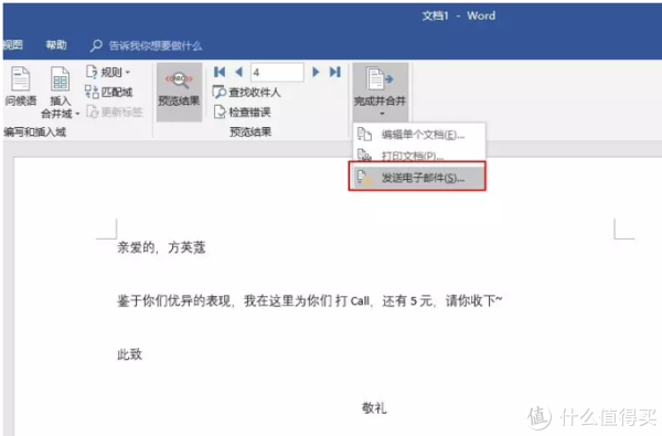 这个时候撰写完毕,我们可以看到文本中已经插入我们在Excel里面预先设置好的内容了。可以利用【预览结果】来观察一下不同的邮件内容。