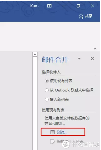 这个时候你会在WORD的右侧看到一个名为【邮件合并】的侧边栏,依次选择电子邮件>>使用当前文档>>选择收件人