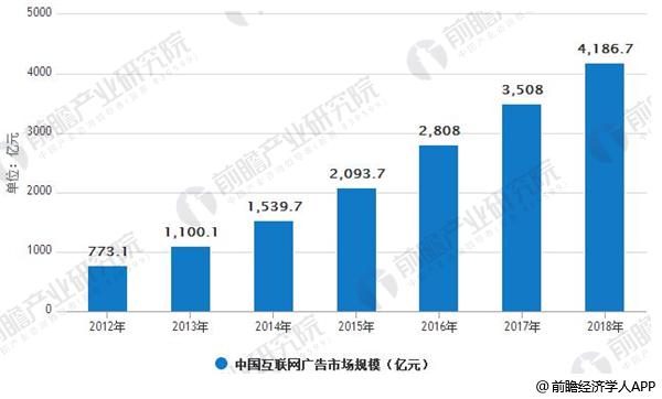 互联网广告市场经历近10年高速发展后,正式市场规模已经超过千亿,在广告行业占据半壁江山,成为广告行业增长主要驱动力。据前瞻产业研究院发布的《互联网广告行业市场前瞻与投资战略规划分析报告》数据显示,互联网广告三年复合增速38%,移动互联网广告三年复合增速181%。2015年中国互联网广告市场规模为2093.7亿元,三年复合增速38%。到2017年中国互联网广告市场规模为3508亿元,预计2018年中国互联网广告市场规模为4186.7亿元。