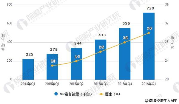 2014-2016年虚拟现实设备累计销售数量及其增速