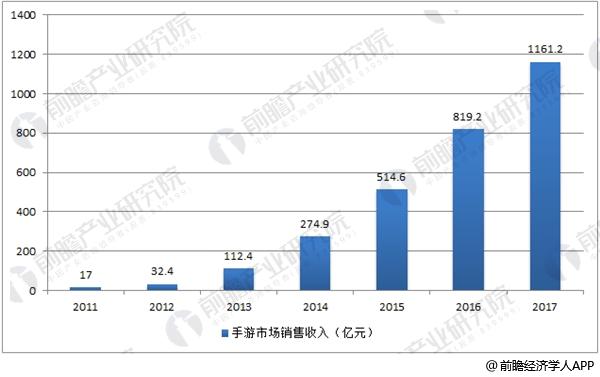 国内网络游戏以手游为主,占据了游戏市场近60%的市场份额。由于手游无需长时间下载且具有通过智能手机随时随地可玩的方便与便携性,其市占率从2011年的 11.6%逐步增长到2017年预计的65%,市场规模达到1162亿人民币,成为行业主导游戏品类。