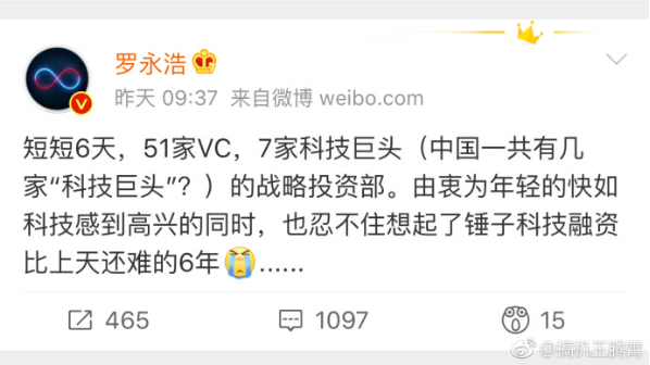 “说实话,子弹短信最近是真火,感觉身边不少朋友都在用。昨天跟一个投资圈朋友聊天听说,子弹短信刚完成1.5亿A轮融资,预计整体估值6亿,据说是成为资本和高榕资本领投,你们觉得子弹短信那么火的原因是啥?“并@罗永浩 。