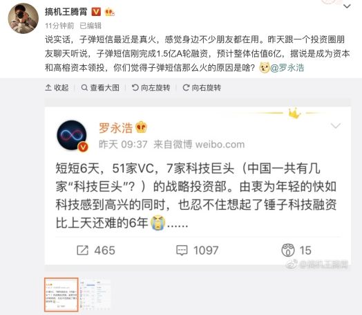 自8月20日,子弹短信伴随坚果Pro 2S发布以来,迅速成为最热门的社交通信软件,一度霸屏APP Store,上市仅7天下载量超过百万。随着子弹短信用户迅猛增长,资本市场开始关注子弹短信出品公司快如科技。据锤子科技罗永浩微博表示,短短6天,51家VC,7家科技巨头(中国一共有几家“科技巨头”?)的战略投资部。由衷为年轻的快如科技感到高兴的同时,也忍不住想起了锤子科技融资比上天还难的6年。言外之意,子弹短信正成为投资巨头追捧的香饽饽。