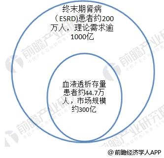 根据前瞻产业研究院最新发布的《血液透析行业发展前景预测与投资战略规划分析报告》统计数据,目前我国终末期肾病(ESRD)患者200多万人,需要进行透析治疗,而根据卫生部统计数据,目前我国血液透析人数约44.7万人,按年透析费用7.5万元计算,目前我国血透市场规模约335亿元。