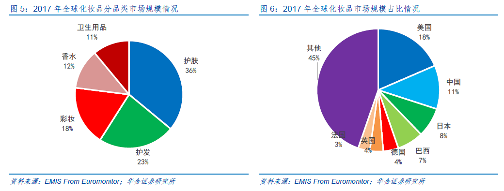 全球市场增速放缓,发展中国家增速高于成熟国家。2017年全球化妆品市场规模4648.35亿美元,同比增长5.25%。自2010年以来,全球化妆品市场规模增速明显走低,跟经济放缓有关;2015年出现下滑主要是欧元区需求不振以及主要消费国之一巴西出现经济下滑(巴西地理统计局公布2015年巴西经济萎缩3.8%),导致2015年全球市场走低。分国家看,2008-2016年新兴国家的化妆品市场规模复合增速明显高于成熟国家,TOP3分别是印度、巴西和中国,期间CAGR分别为13.4%、9.1%、9.1%,高于同期全球4.6%的复合增速。