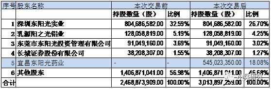 2017年2月16日,广东东阳光科技控股股份有限公司(以下简称“东阳光科”,600673.SH)发布公告称,拟向宜昌东阳光药业股份有限公司(以下简称“宜昌东阳光药业”)发行股份购买其持有的宜昌东阳光长江药业股份有限公司(以下简称“东阳光药”,1558.HK)226,200,000股内资股(占东阳光药股份总数的50.04%)。按照该公告,一旦收购收购完成后,宜昌东阳光药业将变更为东阳光科第二大股东,具体如下: