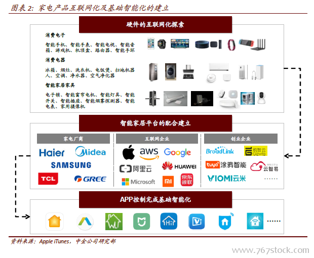 智能家居平台的配合建立:伴随互联网化家居产品数量的增多,对于便捷统一的控制面板的需求提升。在此背景下,2014 年苹果推出HomeKit、三星推出智能家居平台SmartThings Hub、京东搭建JD+平台、海尔推出U+云平台等,作为控制各种智能化的产品的入口,配合相应的手机APP,智能家居行业至此初步建立起了“硬件—平台—APP”的互联控制体系,概念落地提速。