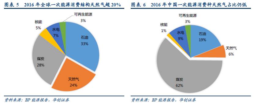 燃煤主导的能源消费结构亟待向天然气优化。然而由于煤炭成本低廉且国内资源丰富,目前我国对于煤炭的依赖程度仍较高,根据英国石油公司(BP)的报告,2016 年我国煤炭消费占一次性能源消费的比例达到62%,天然气仅为6%,而世界整体煤炭与天然气的占比相差不大(分别为28%、24%)。由于煤炭在能耗和环保方面与天然气有较大差距,因此目前重煤轻气的结构已经对可持续发展造成极大压力,能源结构调整势在必行。