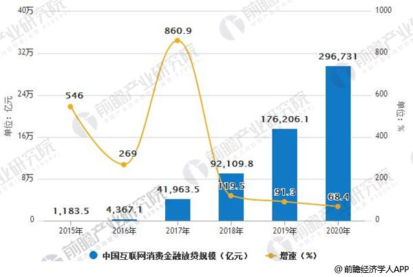 2015-2020年中国互联网消费金融放贷规模及增速情况