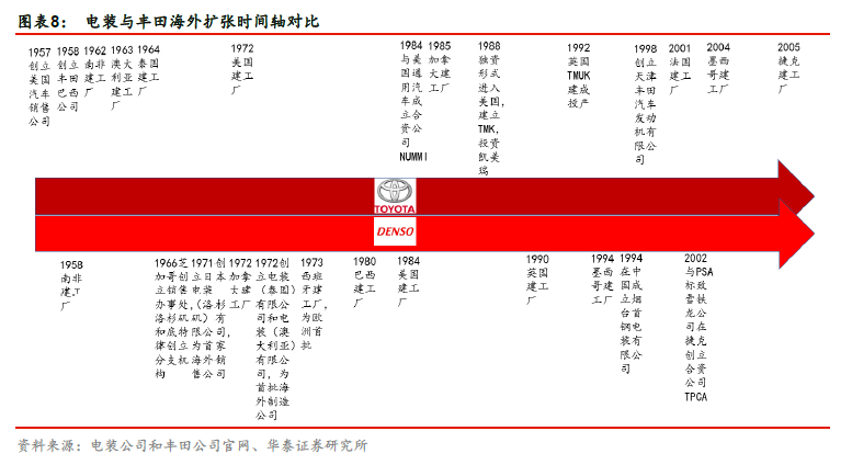 背靠整车厂商,海外扩张与丰田汽车具有同步性。丰田集团起步自纺织机行业,于1937年正式成立丰田汽车工业公司。丰田汽车公司在全球28 个国家和地区拥有51 家海外生产公司,汽车产品销往170 多个国家和地区。电装与丰田的海外研发、生产基地及销售网络的建设具有一定程度上的同步性,我们认为丰田的海外扩张步伐对电装公司的发展壮大具有决定性的影响。
