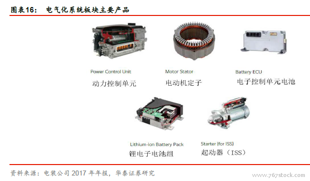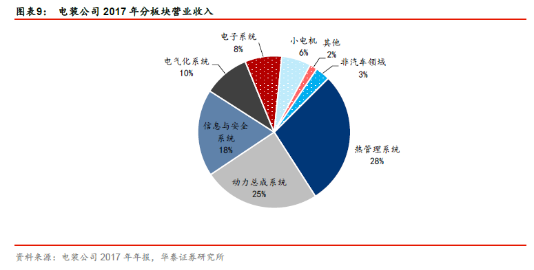 电气部件开发起家,逐渐布局动力总成和信息安全系统领域。电装公司成立之初的业务以电气部件开发和生产为主,自1955 年创立喷射泵预备部门之后,公司开始拓展其他业务领域,并逐渐在热管理系统、动力总成系统、信息与安全系统、电气化系统、电子系统、小电机等多种产品领域开展经营。根据公司2017 年报,热管理系统、动力总成系统和信息与安全系统三大板块业务为公司的支柱业务,营收分别占比28.4%、24.7%和18.5%,总共占比71.6%。公司注重各板块产品的技术研发,强调企业的社会责任,致力于提高产品的环保性、安全性和舒适性。