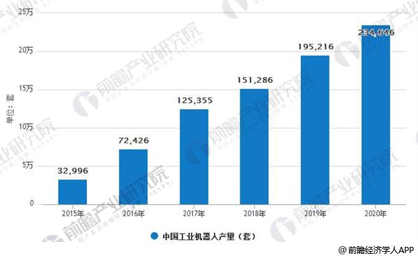 据前瞻产业研究院发布的《工业机器人行业战略规划和企业战略咨询报告》数据显示,2016年中国工业机器人产量为72426套,与2015年相比增长34.3%。随着我国工业机器人的普及与及工业机器人技术的成熟化,未来我国工业机器人市场发展前景可期。值得关注的是2017年9月中国工业机器人产量增长103.2%,达到13085套。1-9月中国工业机器人产量达95351.0套,同比增长69.4%。到2017年中国工业机器人产量达到了125355套,同比增长73.1%。预计2018年中国工业机器人产量将达151286套,到2020年中国工业机器人产量将达234646套。