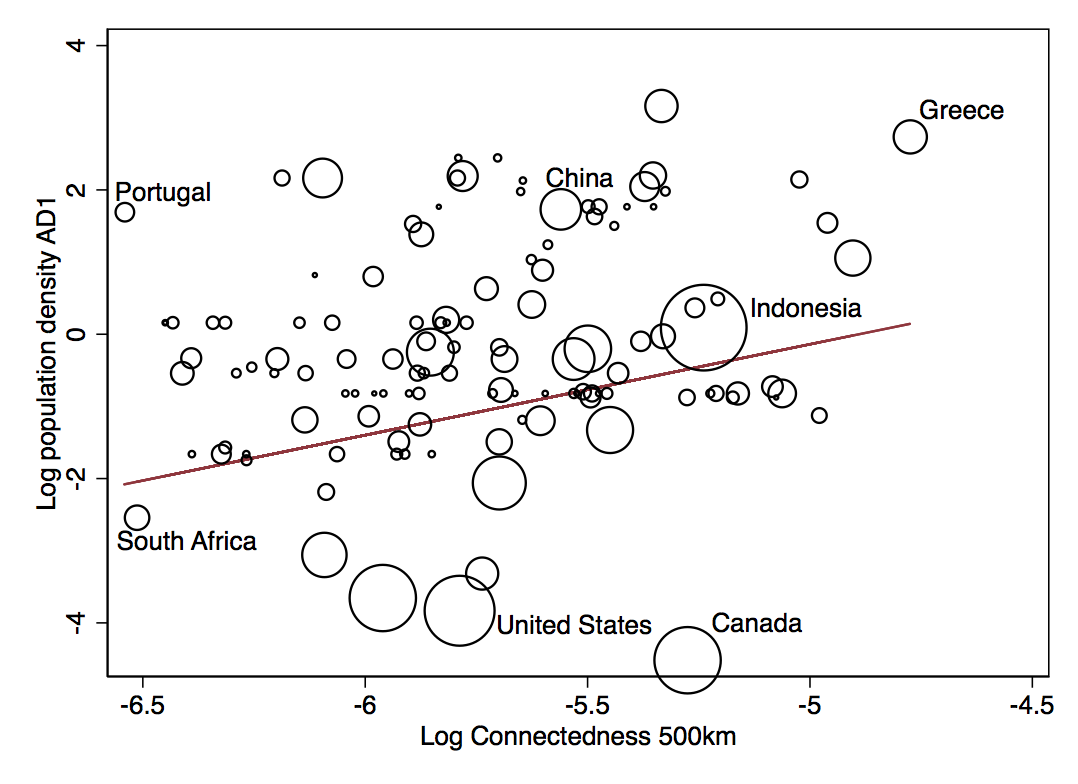 Not purely a Mediterranean phenomenonWhile we have the most systematic data on archaeological sites for the Mediterranean, we also explore whether we can find similar effects at a world scale. For this exercise we use a measure of population density in the year 1 AD, constructed by economic historians McEvedy and Jones (1978). This measure varies only at the level of modern countries, so we also aggregate connectedness to the country level. As Figure 2 shows, there is a strong positive relationship between a country’s average connectedness and its population density in year 1 AD as well.