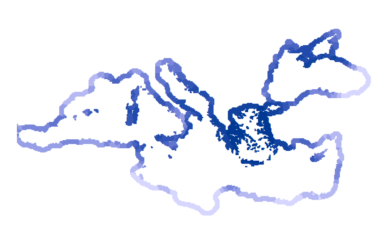 Empirical evidenceTo analyse whether this increased trade also caused growth, we exploit the fact that open sea sailing creates different levels of connectedness for different points on the coast. The shape of the coast and the location of islands determineshow easy it is to reach other points, which might be potential trading partners, within a certain distance. We create such a measure of connectedness for travel via sea. Figure 1 shows the values of this measure on a map and demonstrates how some regions, for example the Aegean but also southern Italy and Sicily, are much better connected than others.