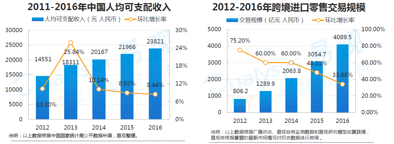 中国跨境贸易总量保持高位稳定 内需拉动进口回暖。统计数据显示,跨境进出口在经历了2015年的跌幅后,均呈现回暖态势,并保持高位稳定。跨境出口2016年达到13.84万亿元人民币,跨境进口规模2016年达到10.49万亿规模,贸易顺差进一步降低。