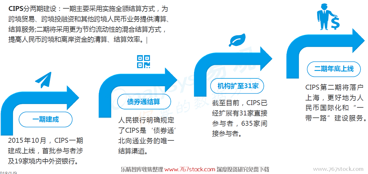 人民币跨境支付系统(CIPS)二期将落户上海 成‘债券通’。北向通业务的唯一结算渠道。CIPS分两期建设:一期主要采用实施全额结算方式,为跨境贸易、跨境投融资和其他跨境人民币业务提供清算、结算服务;二期将采用更为节约流动性的混合结算方式,提高人民币跨境和离岸资金的清算、结算效率。
