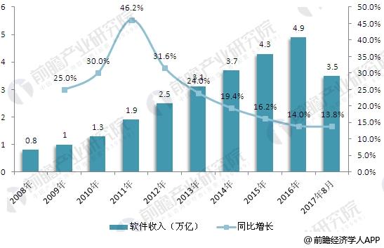 据前瞻产业研究院发布的《软件行业市场前瞻与投资战略规划分析报告》数据显示,2016年软件业务收入保持较快增长,完成软件业务收入4.9万亿元,同比增长13.95%,增速同比回落2.26个百分点。2017年1-8月我国软件和信息技术服务业共完成软件业务收入3.5万亿元,同比增长13.8%。