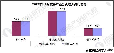 2017年8月止,软件产品实现收入10680亿元,同比增长12%,占总营收的30.9%;信息技术服务实现收入18510亿元,同比增长16%,占总营收的53.5%;嵌入式系统软件实现收入5412亿元,同比增长10.1%,占总营收的15.6%。