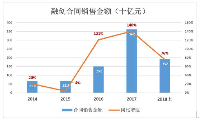 进入2018年,融创终于慢了下来。上半年合同销售金额1915.3亿,同比增速降至76%,仅为2017年的一半。