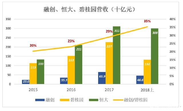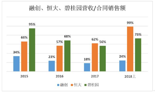 虽然2017年融创合同销售金额达到碧桂园的66%,但营收相当于碧桂园的29%。