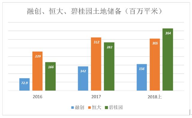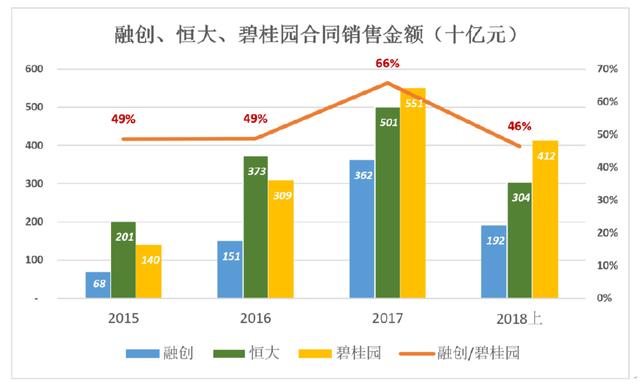 2016年恒大以3734亿合同销售金额拔得头等。2017年碧桂园以5508亿元超越恒大,这一年融创也很猛,3620亿合同销售额相当于碧桂园的66%。但2018年H1又回落到碧桂园的46%。