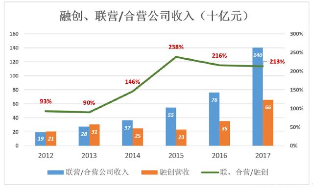 2017年,联营/合营企业销售收入1404.7亿元,相当于融创的213%。融创只能将“亲自”完成的597.5亿确认为营收,联营/合营企业一千多亿不能并入。