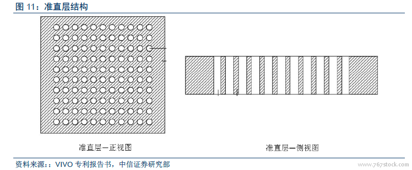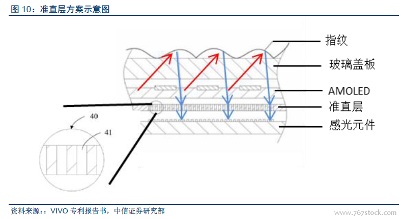 指纹识别折返光线存在折射和散射,准直层将光线转化为清晰度更高的准直光。针对智能手机屏下指纹识别的设计,是在显示屏下堆叠光学指纹感光元件。模组方案之上而下分别为玻璃盖板、AMOLED 显示层、准直层、滤光片、感光元件层,通过OLED 自放光照射到盖板玻璃上方的某一限制区域的指纹,产生的反射光至少要穿过盖板玻璃和显示层,由于盖板玻璃具有一定的厚度,光线在透过返回的过程中会发生比较严重的折射和散射,导致指纹影响无法在光学指纹芯片上清晰成像,厂商通过在感光芯片层和显示层之间加入一层准直层来解决上述问题,准直层从结构上讲就是一层板上有若干个光通道,其结构可以使光纤,或者其他可以将发散光转化为准直光的透镜结构,除了通道是是透光的,壁面及其他区域都采用遮光材料涂覆。运行过程中,反射光通过盖板玻璃、OLED 层后进入准直层,在准直层过滤折射、散射光,使得到达感光元件层的光线为准直光,从而获得清晰成像。