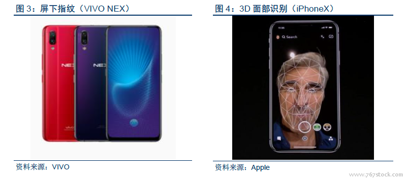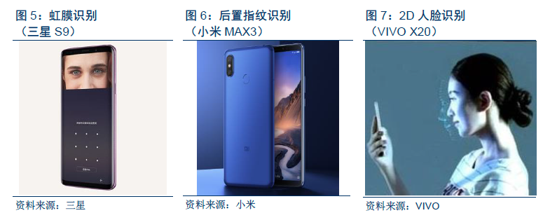 屏下方案符合用户习惯且成本较低,有望成为生物识别新趋势。在全面屏手机的五种生物识别方案中,后置指纹识别由于其只是简单将前置模块移至后置,且仍然是传统电容式指纹识别,在技术上并无显著升级,所以最早应用于全面屏手机。但是由于在便捷性上不及正面方案,对于手型较小的用户不便,且会破坏机身背部整体性,在美观程度上也有所不足,我们认为此方案只是屏下、3D、虹膜尚未商用时厂商采用的低成本方案,后续的方向大概率将指向中低端机型以及作为3D、虹膜等的辅助。3D 人脸识别目前仅在苹果iPhoneX,小米8,OPPO FindX 上有所应用,其20 美元左右的模组价格为进一步推广的一大掣肘。相对于前置应用于生物识别,我们认为后置3D 结构光方案与AR/VR、人工智能结合将是一个更广阔的市场。虹膜识别则仅在三星品牌中有所应用,其他主流终端厂商尚无引进的态势。2D人脸识别仅在软件上有所提升,运行时通过摄像头读取面部一定数量特征点并与预存图像进行对比,目前在全面屏手机中的应用较为广泛,但是随着全面屏向极值屏占比发展,正面的摄像头之类的元件必然会被移出,后续我们认为其应用方向仍然是中低端非旗舰、非极致全面屏机型。而屏下指纹方案既满足了全面屏时代对于取消手机Home 键的要求,同时也符合用户在手机正面操作的习惯,目前应用的厂商有VIVO、小米、华为,潜在还将有OPPO、三星等加入阵营。此外,由于模组整体的价格已从15 美元降至8 美元左右,有望成为手机生物识别发展的新趋势。