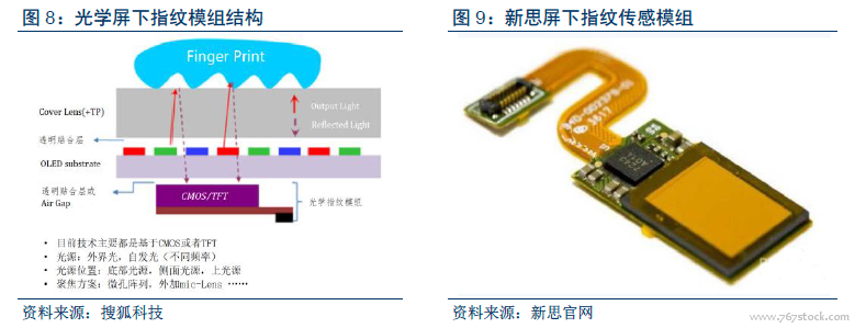 国产手机厂商主导,屏下指纹光学方案日新月异。光学屏下指纹的应用始于国产VIVOX20 Plus 屏幕指纹版本,是由VIVO 在2018 年CES 展会上发布,指纹识别方案是由新思提供的FS9500 Clear IDTM。随后在2018 年3 月,VIVO X21 发布,新机搭载第二代屏下光学指纹识别技术,采用新思方案以及汇顶科技的屏下光学指纹识别方案。在2018 年6 月,VIVO 发布旗舰机VIVO NEX,搭载第三代屏下光学指纹识别技术,汇顶科技独家供应方案。其他品牌机方面,华为Mate RS 保时捷版于2018 年3 月发布,搭载汇顶方案。小米8 透明指纹探索版于2018 年5 月发布,同时采用新思和汇顶方案。魅族16 于2018 年8 月发布,其屏下指纹采用汇顶方案。