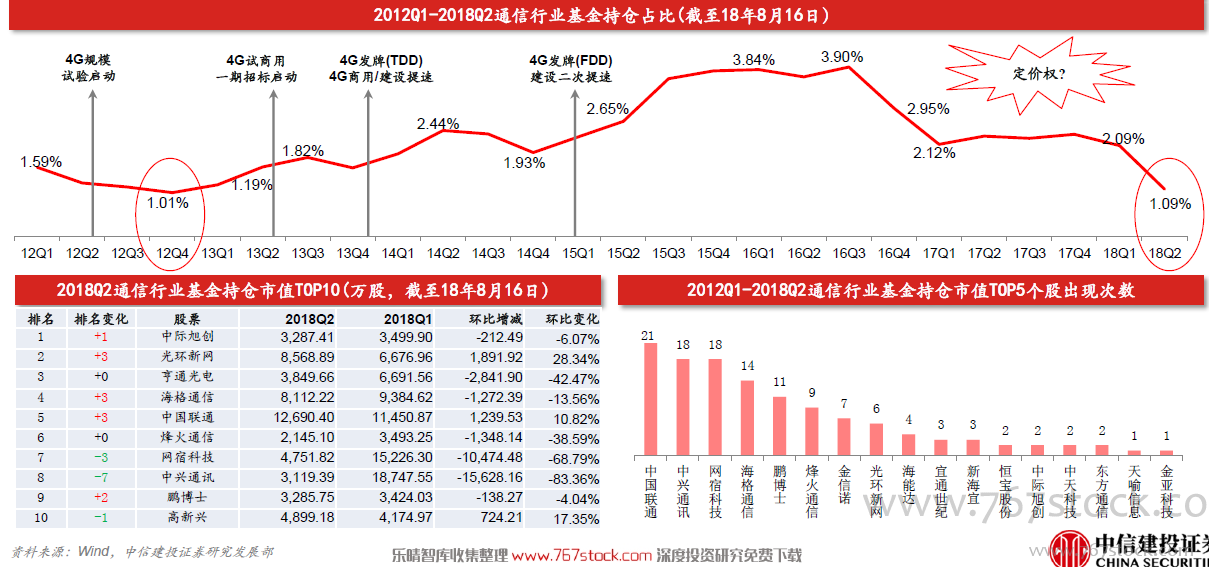 18Q2,通信行业基金持仓市值占比1.09%,系近26个季度中的次低位置。回顾2012年以来的通信行业基金持仓市值占比,12Q4-13Q3(2013年12月4日4G发牌)系4G概念炒作期,持仓比例逐步提升。之后,进入业绩兑现期与应用爆发期,持仓比例先降后升,虽有波动,但总体向上,一度达到3.9%,16Q4进入下滑期,17年整体平稳,18年明显回落;