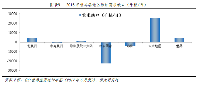 从原油储量角度看,亚太地区原油储量低下,这是亚洲对原油进口依赖大、进口成本相对高的原因之一。根据《BP世界能源统计年鉴(2018年6月版)》,截至2017年末,全球原油探明储量为16966亿桶,预计足够全球使用50.6年,其中亚太地区原油储量占比仅为约3%,中东地区占比约48%,是亚太地区原油探明储量的16倍。探明储量很大程度上影响最大可建设油田数量的多少,进而影响原油最大产量、供给,较低的原油储量影响亚太地区的长期原油供给水平,使亚太地区购买原油需支付额外成本,即“亚洲升水/溢价”。