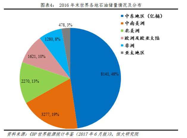 全球原油探明储量呈现缓慢增长的趋势,但由于原油的不可再生性及原油探明的偶然性,长期来看,原油探明储量增速将继续下降。1996、2006、2016年,全球原油探明储量分别为11488、13883、16915亿桶,1996-2006年、2006-2016年全球原油探明储量复合年均同比增速分别为1.91%、1.2%,增长缓慢。
