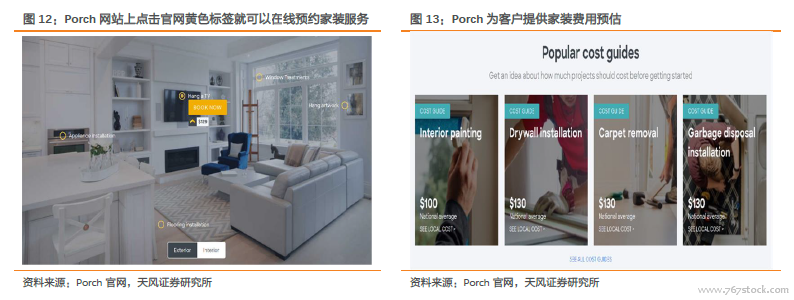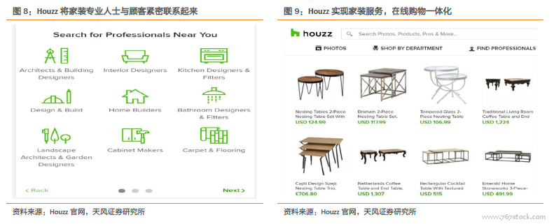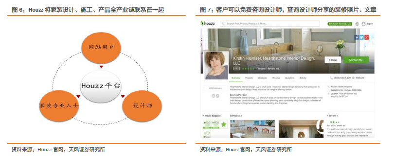 互联网家装成为北美家装市场新亮点。互联网家装公司为顾客与设计师、家装公司提供了有效的交流平台。美国居民在整个再装修环节中通常会选择寻求专业设计公司提供设计服务,之后自己亲自动手进行家装或者聘请居住社区附近口碑较好的专业家装公司施工。然而由于整个家装行业过于分散,顾客很难获取大量设计师及家装公司的信息进行筛选和有效的沟通。随着互联网技术的发展,Houzz、Porch 等互联网家装公司应运而生,其中尤以互联网信息撮合商Houzz 发展最为迅猛。