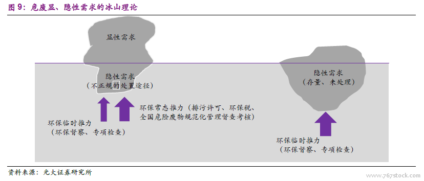 官方统计量的意义在于:反映环保力量所触及之处的显性需求。当前我国危废产量实行企业申报制度,随着《“十三五”全国危险废物规范化管理督查考核工作方案》的出台,各地已建立起省、市、县三级重点监控企业名单的背景下,官方统计数据的意义在于反映出环保力量所触及之处所引起的危废治理需求,即危废的显性需求。