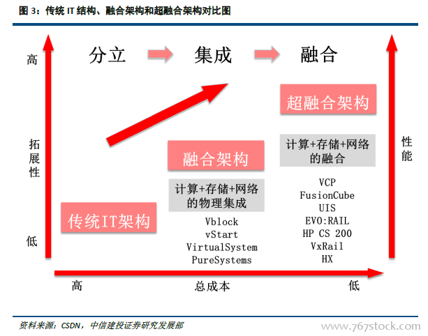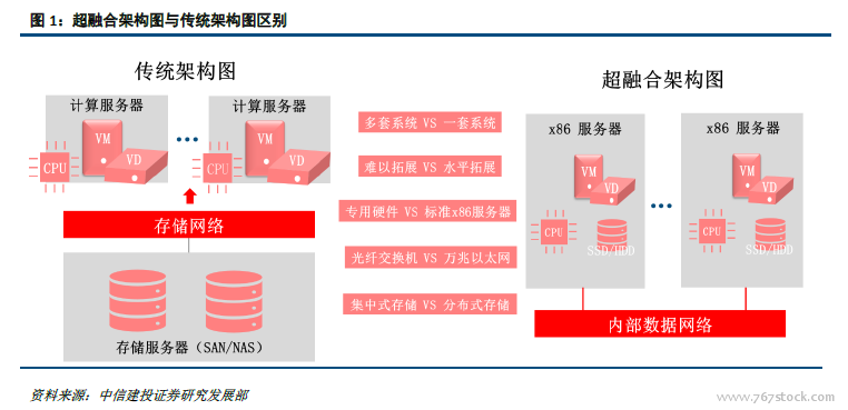 内部驱动,超融合总成本下降愈六成。新经济时代下,目前传统架构的建设通常对服务器、存储、网络设备、平台及应用软件等部件独立采购,而后再集成。然而随着云数据中心规模的不断扩大,传统构架的部署和后期的运维会使企业耗费过多的人力物力,进而导致IT效率低下,终将阻碍业务发展。超融合通过将x86服务器打造成通用的共享硬件基础架构,将服务器、存储、网络设备、平台及应用软件等合为一体,大大简化了IT结构和运营效率,有效降低了长期运维和时间价值成本。以Wikibon的研究报告为例,其在全面比较超融合架构和传统架构之后,得出结论:超融合架构相比于传统架构共节省成本890万美元,占传统架构总成本的66%。其中3年的运维成本降低了36%,3年的时间价值成本降低了77%。
