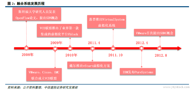 好雨知时节,“融合”应势而生。在本世纪初,随着以VMware为代表的虚拟化技术的兴起,服务器、存储和网络等均已支持虚拟化技术。2008年,斯坦福大学Nick McKeown教授团队,基于OpenFlow为网络带来的可编程的特性,提出了SDN(Software Defined Network,软件定义网络)的概念。2009年,SDN概念入围MIT Technology View十大突破性技术,自此获得学术界和产业界的广泛认可。