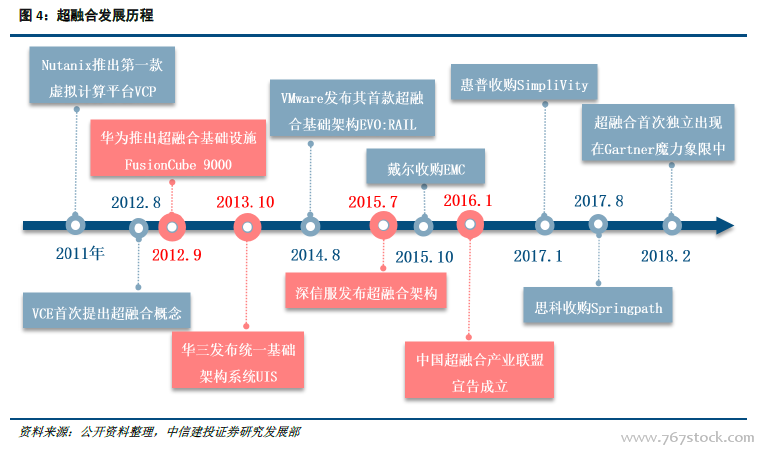 当春乃发生,“超融合”方兴未艾。虽然融合系统提供了预集成、预验证的全套解决方案,简化了用户的采购、部署、运维等环节。但是,各大组成部分只是“粘贴”在一起,并没有实现真正的“融合”,计算和存储依然是分立存在的,相当于是在一个机柜里的物理设备的系统集成。基于此,2012年8月,VCE CTO办公室的Steve Chambers在其博客上首次提出超融合(Hyper Converged)的概念。在向超融合发展中,计算和存储才算是真正“融合”一体,逐渐演变为在同一个标准x86服务器硬件资源上实现计算和存储功能,封装成单一的、高度虚拟化的解决方案,且各节点间没有明确的计算和存储的分工。