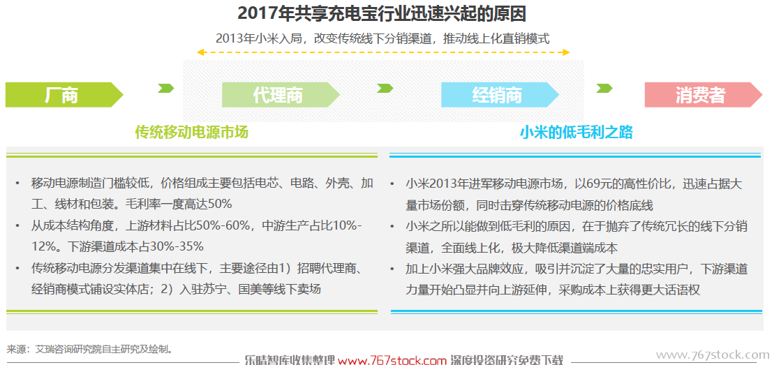 小米入局击穿移动电源价格底线,传统企业求解自救良方。国内移动电源市场起步于2001年,经过概念框架搭建和初期试水后,在2006年前后以商品化形式进入终端市场。移动电源制造门槛较低,且毛利一度高达50%,吸引了大量企业纷纷涌入,共分市场利益。2013年小米的入局,以69元的低价迅速跻身业内销量一线梯队,极大压缩了传统充电宝的售卖空间。小米的革新在于线上化的分销模式,有效降低了下游渠道成本,并利用用户量优势向上游材料、生产制造等环节延伸,置换更多话语权。传统移动电源企业受缚于思维和企业经营模式的局限,在市场的冲击下面临危机。