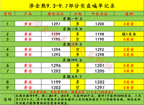 看盘是分析师的事,大家甚至只需要看看消息通知进场离场就可以了,别把自己整的一天到晚提心吊胆还处处亏钱,道理我相信大家都懂,可就是还安于现状,你小亏认为能赚回来,大亏认为其他人都是蒙人,不断的选择,资金越来越少,直到最后而失去选择。那你还不如早一点找到渗金熊,本周渗金熊共操作了9单获利30个点,表中也能看到,渗金熊老师操作单数一直不多,也存在损单,分析师不是神,多的只是自己实战的经验加上专业扎实的专业知识,存在损单也不足为奇,如果有人跟你说他可以做到百分之百的准确,那么渗金熊劝你一句,你可以远离他了。