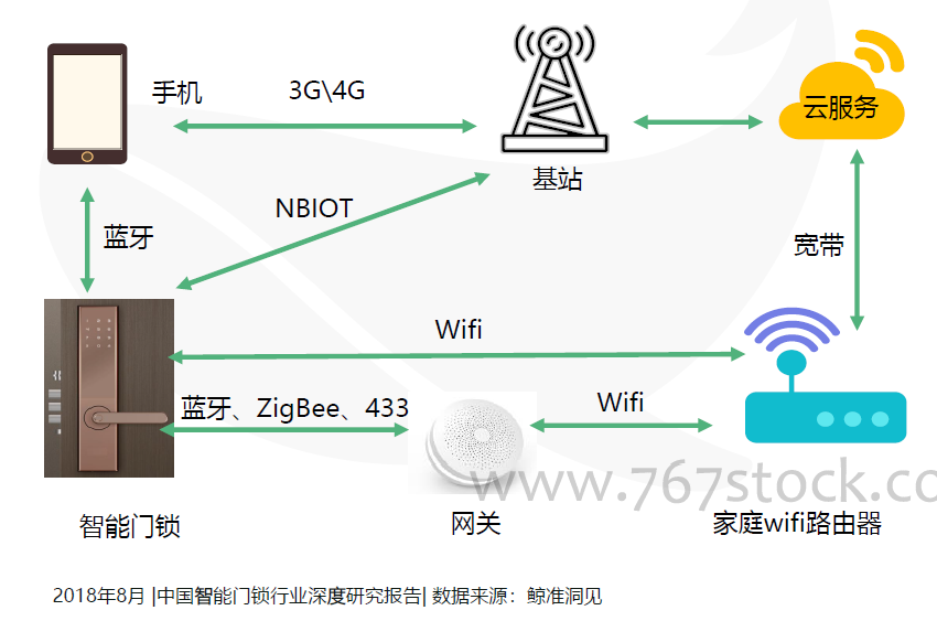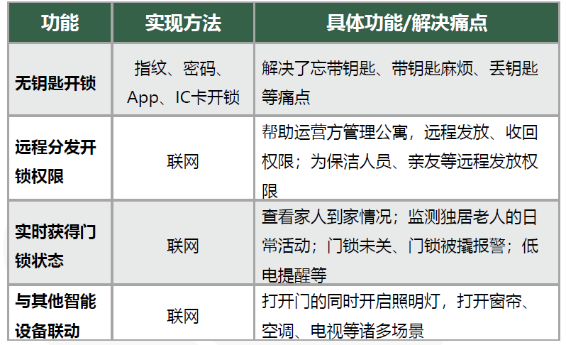 智能门锁的功能。智能门锁的核心功能是“无钥匙开锁”,联网之后,智能门锁可实现分发开锁权限、获得门锁状态、与其他设备联动,基于这四大功能,又发散出诸多具体功能。