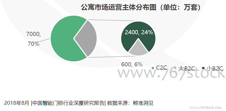 我国公寓智能门锁的现状及分析。2018年我国租赁公寓(包括长租、短租)大约1亿套,租赁住房人口大约2亿,在1亿套出租公寓里面,7000万套是C2C,即房东直接出租给租客,这7000万套归类在家庭锁的范围内,不在公寓锁部分讨论;3000万套是B2C,即商家对租客出租,在这3000万套里,有600万套是自如、魔方、泊寓等品牌公寓(我们称之为大B)。品牌公寓里面,整个公寓锁存量在300万把左右,以1套公寓平均2把锁(有的合租房有内门锁)测算,有150万套公寓安装了智能锁,渗透率25%左右;运营剩余2400万套公寓的小商家(我们称为小B)的智能门锁渗透率无从测算,但一定远低于大B的渗透率,这些小B可能是个人二房东、可能是几个人组成的小创业公司、可能是只有一个店面的小中介,我们认为小B的渗透率会略高于家庭门锁, 在5%-10%之间, 我们取7%,以此计算,整个公寓智能锁市场渗透率在10%左右。