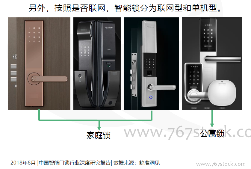 智能门锁分类。按照客户进行分类,分为家庭智能门锁和公寓智能门锁(后文简称家庭锁和公寓锁),如图,家庭锁的客户是我国居民家庭,公寓锁的客户是我国长短租公寓运营主体(如链家的自如),我们这里的“公寓”口径是所有B端(商家)运营的用于出租的居民住房,包括集中式和分散式的公寓。