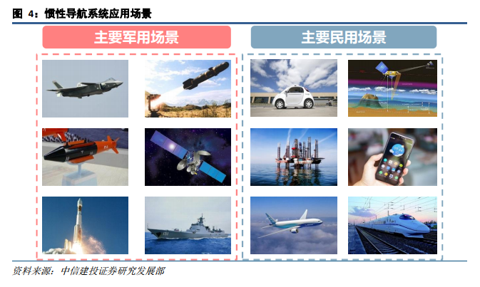 下游应用领域包括军用和民用两部分,军用市场基本被国内军工企业占据,民营企业集中在民用市场。军用领域方面,惯导系统在舰艇船舶、航空飞行器、航天飞机、制导武器、陆地车辆、机器人等装备上均有所应用。我国军工企业具备惯性技术全产业链的生产能力,大部分的军用惯性市场被军工企业占据。民用市场包括大地测量、石油钻井、电子交通、汽车安全、消费电子等领域,其中 MEMS 惯性传感器在消费级市场应用领域最为广泛,且 MEMS 传感器的生产具有规模效应,规模越大,成本越低,竞争力越强。
