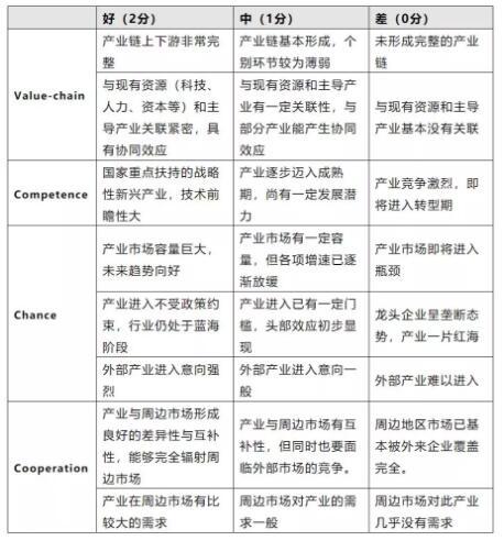 第三步,建立产业评估体系,从产业价值链(Value-chain)和能力(Competence)、机会(Chance)、合作(Cooperation)四个维度出发,对产业发展潜力和发展优势进行评价。