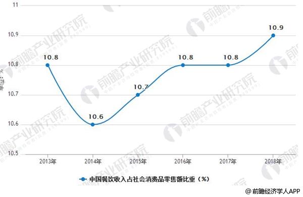 2013-2018年中国餐饮收入占社会消费品零售额比重